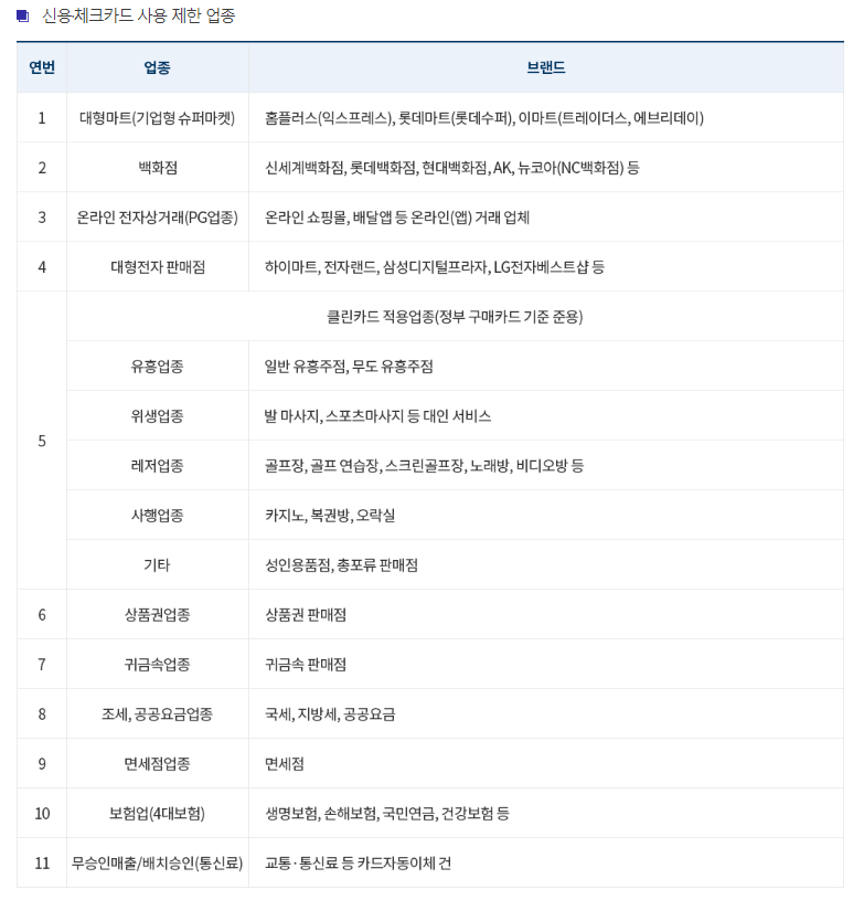 만약, 상세한 사용제한 업종(브랜드)를 알고 싶으시다면, 카드사 홈페이지 및 카드사 콜센터를 통해 문의하시는것이 가장 정확합니다.
