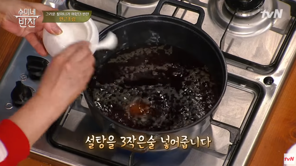 설탕 3 작은술을 간장베이스에 넣고 연근은 너무 얇지않게 적당한 두께로 썰어서 간장베이스와 중불로 끓여줍니다.