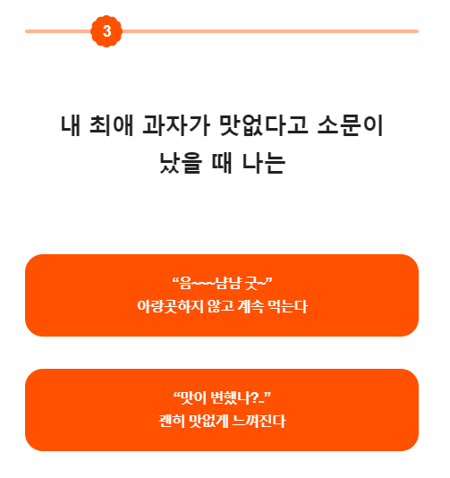 스낵으로 보는 내 성격이라니! 성격 테스트 치고는 뭔가 장난기(?)가 다분해 보이는 이 테스트가 다소 가벼워 보이긴 했었지만, 평소 스낵을 즐겨먹기도 했었고 이런류의 테스트들은 문항도 크게 많지 않기에 가볍게 한번 해봤다.