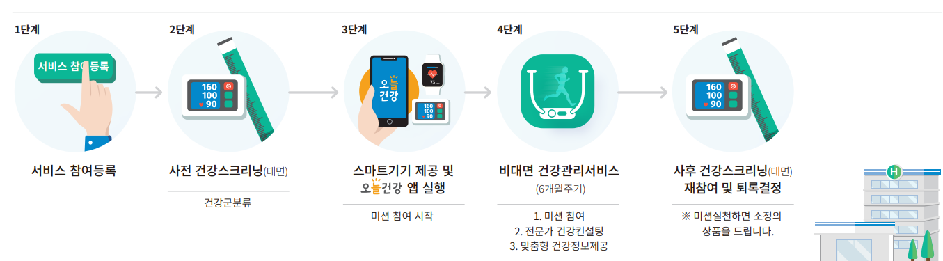 서비스 참여, 건강스크리닝, 스마트기기제공 및 앱 설치, 비대면 건강관리서비스 6개월, 사후 건강스크리닝의 절차로 진행되며 꾸준히 건강관리를 잘 받게되면 소정의 상품도 제공한다고 하니, 이제 집에서도 편하게 건강관리를 받아보시는것을 추천합니다.