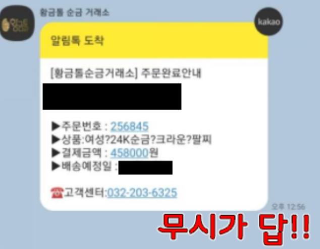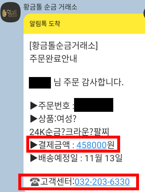 얼핏보기에는 주문내역을 알려주는 그럴듯한 카카오톡 메시지로 보였지만, 황금톨순금거래소에서 약 40만원을 웃도는 귀금속을 구매했다고 알림톡이 와서 확인해보니, 보이스피싱 사기업체로 확인되었네요.