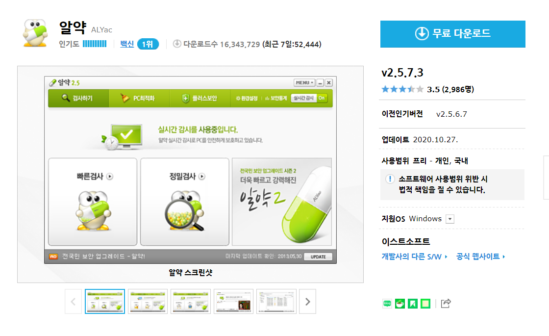 대한민국 무료백신중 1위라고 해도 과언이 아닐텐데, 필자의 경우에도 윈도우 10 디펜더를 꺼놓고, 알약을 따로 설치해서 사용하고 있습니다.