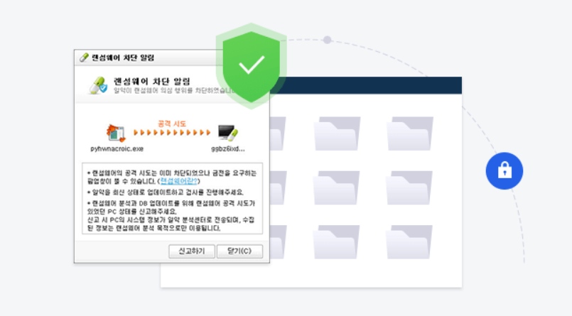 랜섬웨어 공격을 받게 되면, 사용자의 PC 중요 파일들을 암호화, 복호화 해서 실행이 불가능하게 하거나 파일을 열람할 수 없게 만들며 코드를 해독하려면 돈을 요구하는 형태의 공격이 많은데, 알약은 이러한 공격시도를 효과적으로 차단해주며 주기적으로 DB를 업데이트해서 사용자의 PC 환경을 보호합니다.