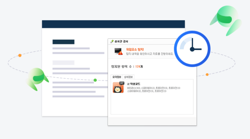 알약의 실시간 감시 기능은 인터넷 검색이나 프로그램 설치를 할 때에 PC에 위험성이 있는 요소들을 실시간으로 감시하고 방어합니다.
