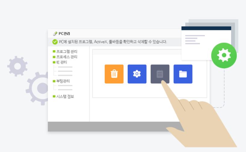 컴퓨터 바이러스 케어 뿐만 아니라, 시작프로그램이나 실행중 프로세스 등 자주 사용하는 PC 환경설정을 알약에서도 컨트롤 할 수 있습니다.