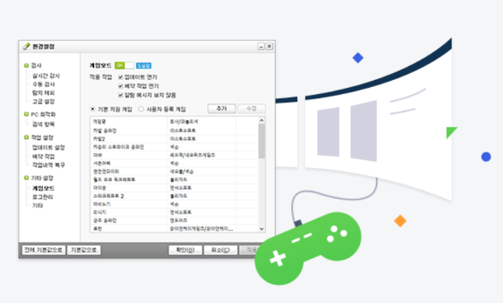 컴퓨터 백신 프로그램들에는 요즘에는 왠만하면 다 탑재되어있는 기능인데, 알약은 게임모드를 제공합니다.