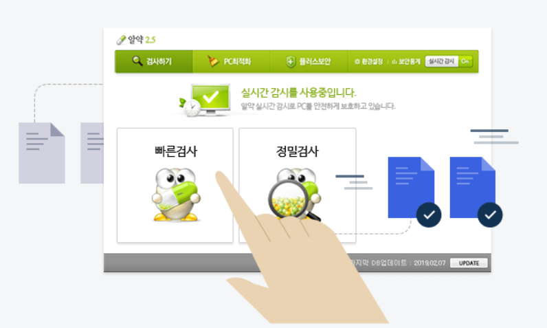 알약은 즉시 피해를 가할 수 있거나 자주 감염되는 악성코드를 빠르게 검사할 수 있습니다.