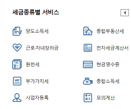 국세청 홈택스 홈페이지에 접속해 세금종류별서비스 > 양도소득세 > 미리계산해보는 양도소득세 > 양도소득세계산을 클릭합니다.