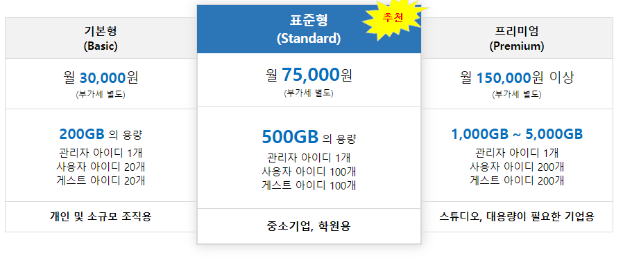 표준형의 경우, 월 75,000원의 가격으로 500GB의 용량을 제공해주는데 월 1만원 남짓한 가격으로 2테라 바이트의 웹 스토리지를 제공해주는 구글 드라이브와는 용량에 아주 큰 차이가 있습니다.