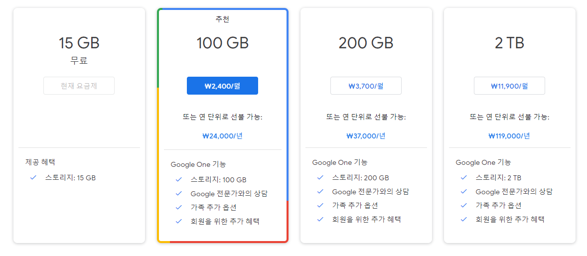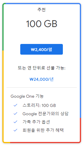 15GB의 무료 용량이 부족하다면, 한달 2,400원짜리 요금제를 사용하게되면 (심지어 1년 미리 결제를 하면 24,000원에 사용 가능) 매월 100GB의 웹 스토리지 저장공간을 사용할 수 있습니다.