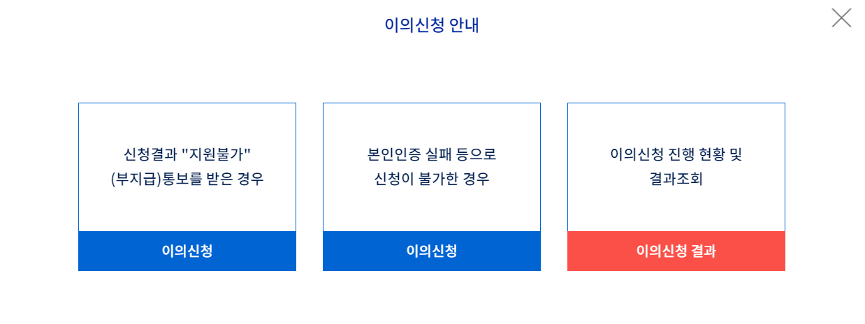 첫번째는, 지원불가 통보를 받은경우, 이의신청 결과조회 메뉴가 있고, 본인인증이 안되어 신청이 불가능한경우에도 이의신청을 할 수 있습니다.