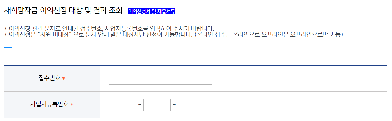 이의신청 버튼을 클릭하신 후, 소상공인 새희망자금 신청했었던 접수번호와 사업자 등록번호를 조회 후 이의신청을 할 수 있습니다.