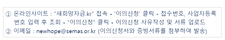 접수 이메일주소인 newhope@semas.or.kr 로 이의신청서, 그리고 증빙서류를 첨부해서 발송하면 이의신청 접수가 완료됩니다.
