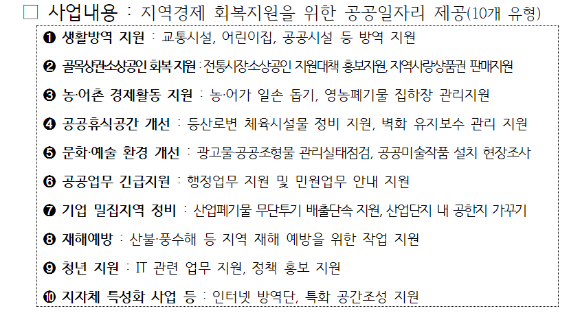 생활방역지원이나, 골목상권소상공인 회복지원, 농어촌 경제활동 지원, 공공휴식공간 개선, 문화예술 환경 개선, 공공업무 긴급지원, 기업 밀집지역 정비 및 재해예방, 청년지원, 지자체 특성화 사업 등 여러가지 지원분야가 있으며, 각 지자체에서 지원되는 사항이 다르므로 정부 24홈페이지에 로그인하신 후 지자체 게시판에서 정보를 확인하는것이 정확합니다.