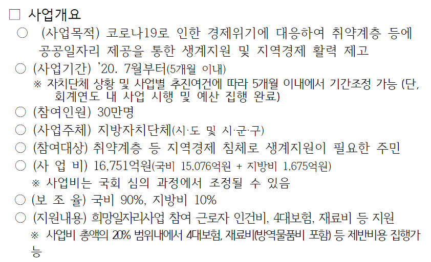 총 사업비는 16,751억원으로 국비와 지방비로 운영되는 사업이며, 지역경제 회복지원을 위해서 공공일자리를 제공하는데, 지원되는 일자리 유형은 다음과 같습니다.