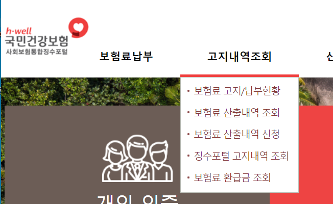개인의 경우, 개인인증을 완료하신 다음 고지내역조회> 보험료 고지/납부현황을 클릭해서 건강보험 및 국민연금 납부, 미납내역을 조회하실 수 있습니다.