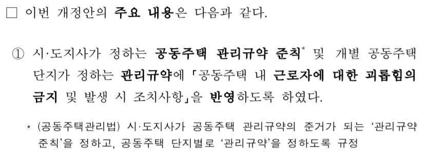 앞으로 아파트 및 공동주택의 경우, 반드시 관리규약에 경비원 및 아파트 근로자에 대한 괴롭힘 금지사항이 반영되어야 하는데요, 이는 아파트 근로자에 대한 입주민의 '갑질'을 차단하기 위한 조치입니다.