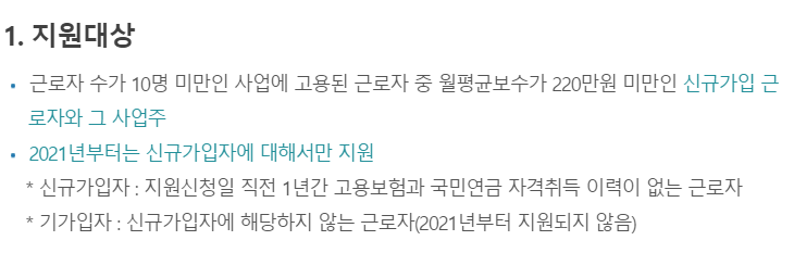 - 신규가입자 기준 - 지원신청일 직전 1년간 고용보험 및 국민연금(4대보험) 자격취득 이력이 없는 근로자.