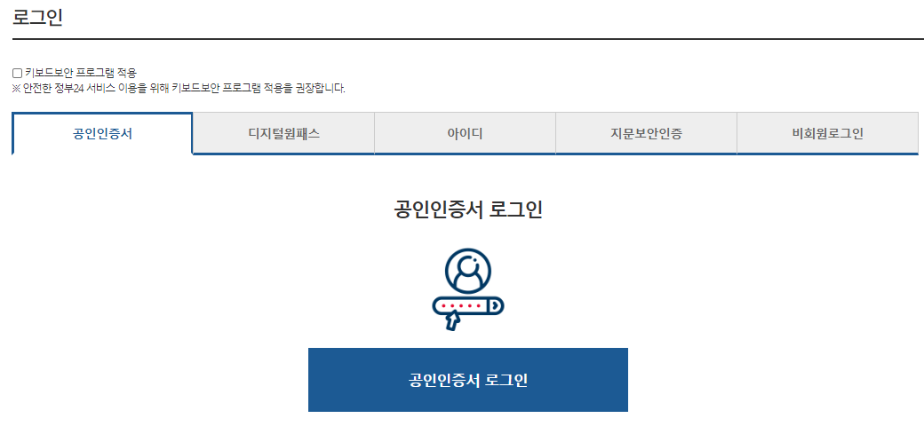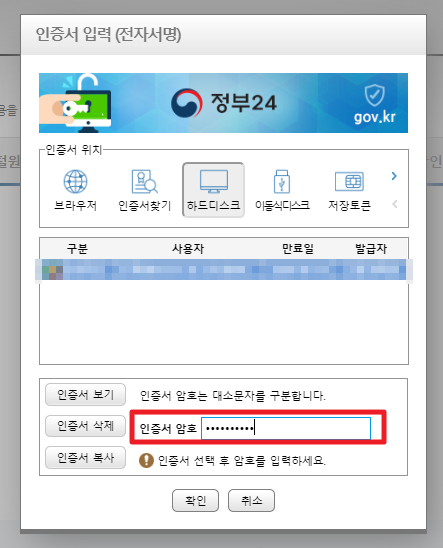 정부24 로그인시, 공인인증서로 로그인을 하였더라도 공인인증서를 통해 한번 더 전자서명을 인증하는 과정이므로, 인증서 암호를 넣고 확인버튼을 눌러주겠습니다.