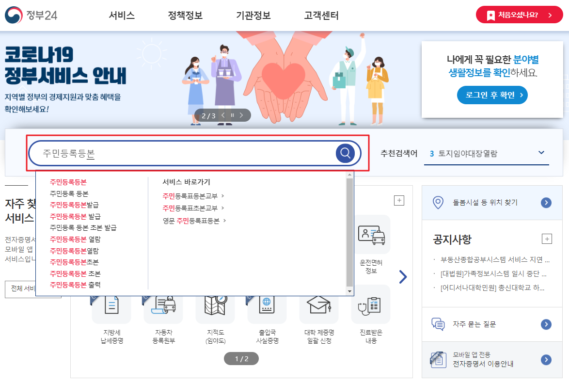 소득금액증명이나, 국민연금 가입내역, 운전면허 정보 및 이번 포스팅에서 다루고있는 주민등록등본,초본까지 왠만한 서류들은 정부24에서 처리할 수 있겠습니다.