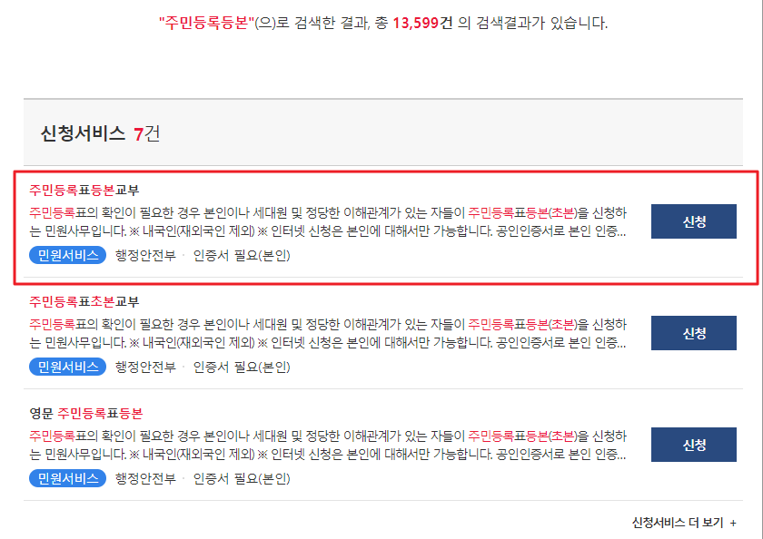 그러면, 위와같이 주민등록표에 관련된 민원서비스들을 볼 수 있겠습니다.