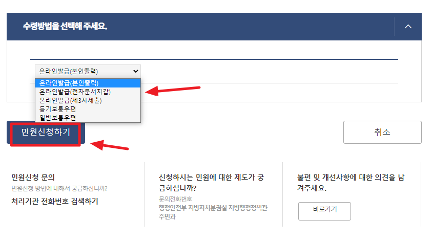 드디어 주민등록등본 인터넷발급의 마지막 절차입니다. 주소지, 발급형태, 수령방법 등을 선택해주시고, 민원신청하기 버튼을 눌러주겠습니다.