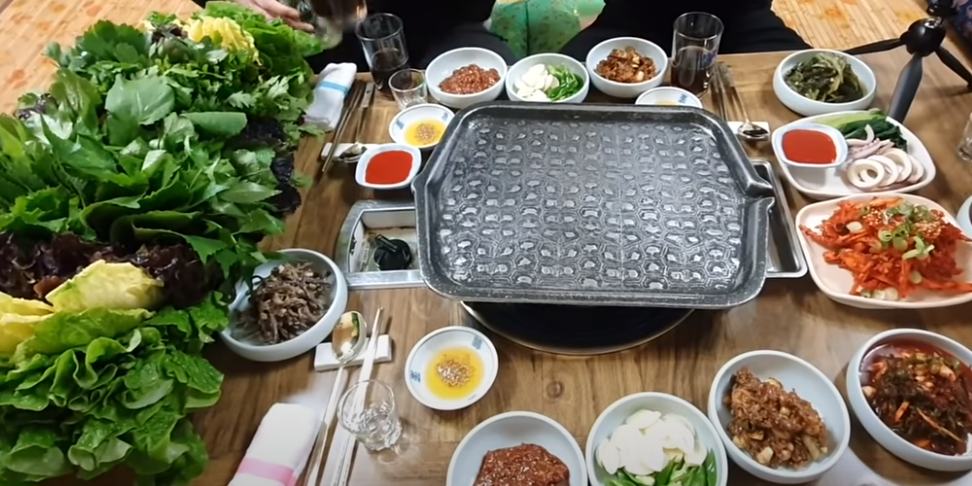 기본 반찬으로는 각종 나물, 쌈채소, 파절이 및 김치가 제공되며 음료와 밥은 무료로 제공되지만 100g에 2만 원의 가격으로 삼겹살 치고는 상당히 높은 가격대를 선보이고 있습니다.