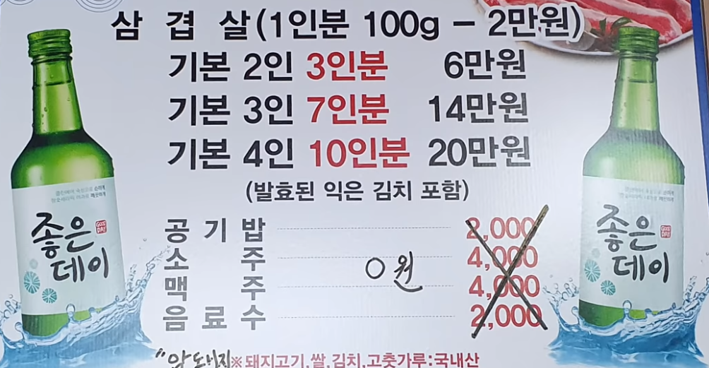 기본 4인부터 오겹살의 주문이 가능하며, 최초 1회 주문 후 고기추가의 경우 1인분에 2만 원의 가격을 받는다고 합니다.