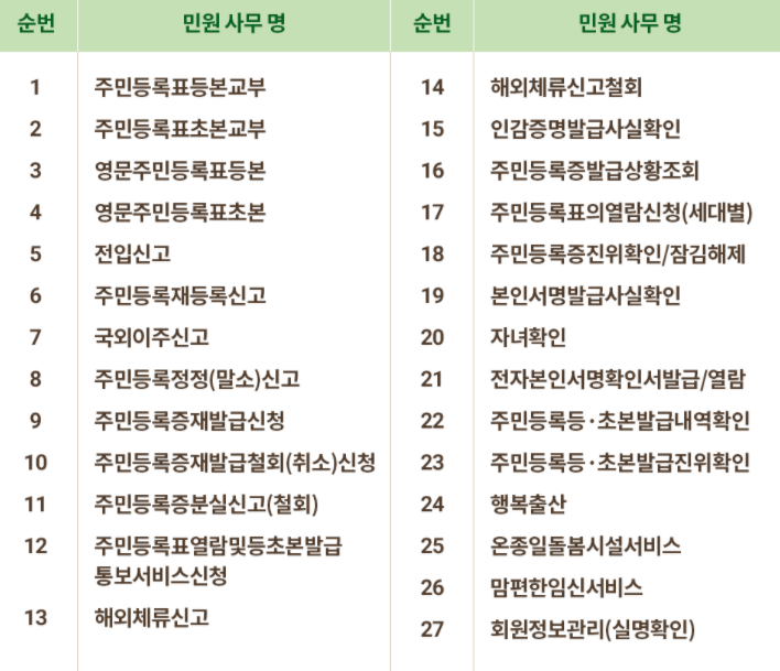 정부24 주민등록 관련 추석연휴 중단되는 서비스 27종은 다음과 같습니다.